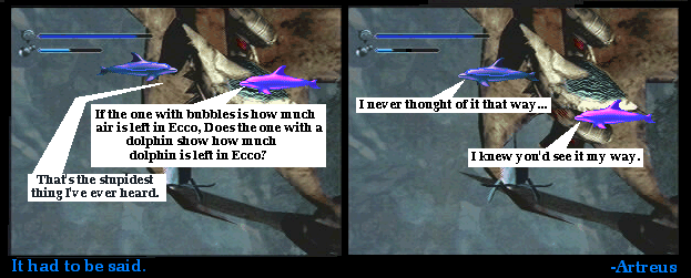 This was a pretty weak one, I think. It's basically a joke told in comic format. But I'm not here to tell jokes, I'm here to show them. I never made an Artreus sprite I like, and purplefin hurts my eyes. Of course, she has one thing going for her: She's the first sprite I made a new pallete for.